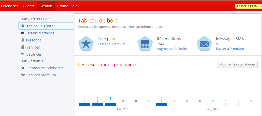 Reservio est disponible en version gratuite. A part de cela, on peut choisir un des trois offres Premium : Starter 8 euros / mois, Standard 15 euris / mois, Pro 30 euros / mois.
